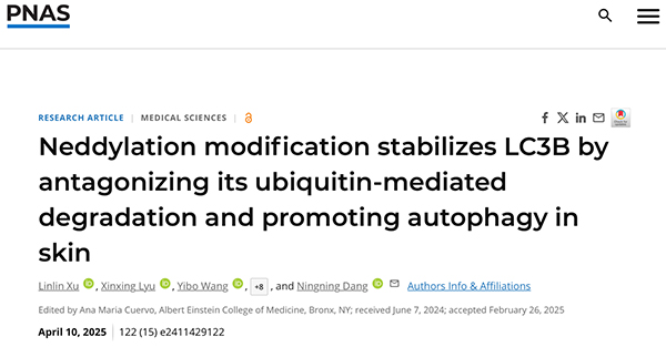 近期,山东第一医科大学附属省立医院(山东省立医院)党宁宁团队在国际高水平顶刊《美国国家科学院院刊》(PNAS,中科院1区TOP期刊)上,发表题为“Neddylation modification stabilizes LC3B by antagonizing its ubiquitin-mediated degradation and promoting autophagy in skin”的研究论著。该研究在国际上首次揭示自噬关键蛋白LC3B存在一种新的翻译后修饰-Neddylation修饰,由E2结合酶UBE2M介导。研究表明,UBE2M介导的LC3B Neddylation修饰有望成为对抗皮肤衰老及相关疾病的潜在靶点,为衰老机制的研究及相关干预提供了新思路。省立医院为论著的第一及通讯作者单位,山东大学博士研究生徐琳琳为第一作者,山东第一医科大学临床与基础医学院黄淑红为共同通讯作者,省立医院皮肤科党宁宁为通讯作者。