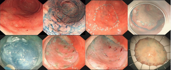 消化道早癌与大众认知的癌不同的是,诊断为消化道早癌意味着病变发现的很及时,换句话说,此时若获得准确诊断及规范化治疗,是可以获得治愈效果的,且不管是食管、胃还是结直肠的黏膜内癌或高级别上皮内瘤变,都可以通过不开刀的内镜下微创治疗取得治愈效果。以早期胃癌为例,可以通过内镜黏膜下剥离术(ESD)将病变从内镜下完整切除。内镜黏膜下剥离术(ESD)操作过程如下图所示,内镜医师使用刀头长度仅2mm的内镜专用刀,将病变及周围黏膜所在的黏膜层及黏膜下层剥离下来,使病变获得整块切除。内镜下治疗后的手术标本需再次送检病理科,制作成病理切片,以供病理科医师出具最终的病理报告。若最终病理报告提示病变已经完整切除,那么后续仅需要定期复查胃肠镜即可,不需要追加外科手术或放化疗。