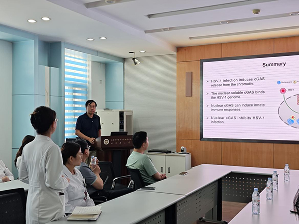 李师弢教授以《Virus-Host Interactions Regulate Host Innate Defense and Viral Pathogenesis》为题作专题报告,系统阐述了病毒—宿主互作调控先天免疫应答及病毒致病性机制的研究进展。报告聚焦流感病毒、乙型肝炎病毒、冠状病毒等典型病毒,深入分析了病毒入侵识别、免疫激活信号通路、RNA表观遗传修饰等领域前沿成果,展示了病毒通过多维调控网络影响宿主防御反应和病毒复制过程的机制。李师弢教授还分享了团队关于流感病毒NS1蛋白通过多通路调控Ⅰ型干扰素信号抑制机制、cGAS通路在介导HSV-1感染免疫应答中的作用研究进展,深入剖析病毒蛋白如何通过调控宿主关键免疫通路实现免疫逃逸,为揭示病毒致病性和抗病毒免疫调控机制提供了新见解。在交流互动环节,参会人员围绕报告内容与李师弢教授展开热烈探讨,现场学术氛围浓厚。