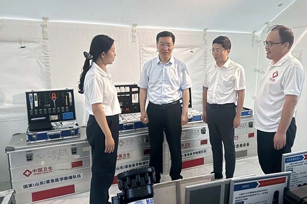 7月3日,山东省海上综合应急演练在东营市成功举行。山东第一医科大学附属省立医院(山东省立医院)承建的国家紧急医学救援队(山东)作为唯一的医疗应急救援力量参与演练。校(院)党委副书记、医院党委书记吴向东,党委委员、副院长王默现场观摩演练。