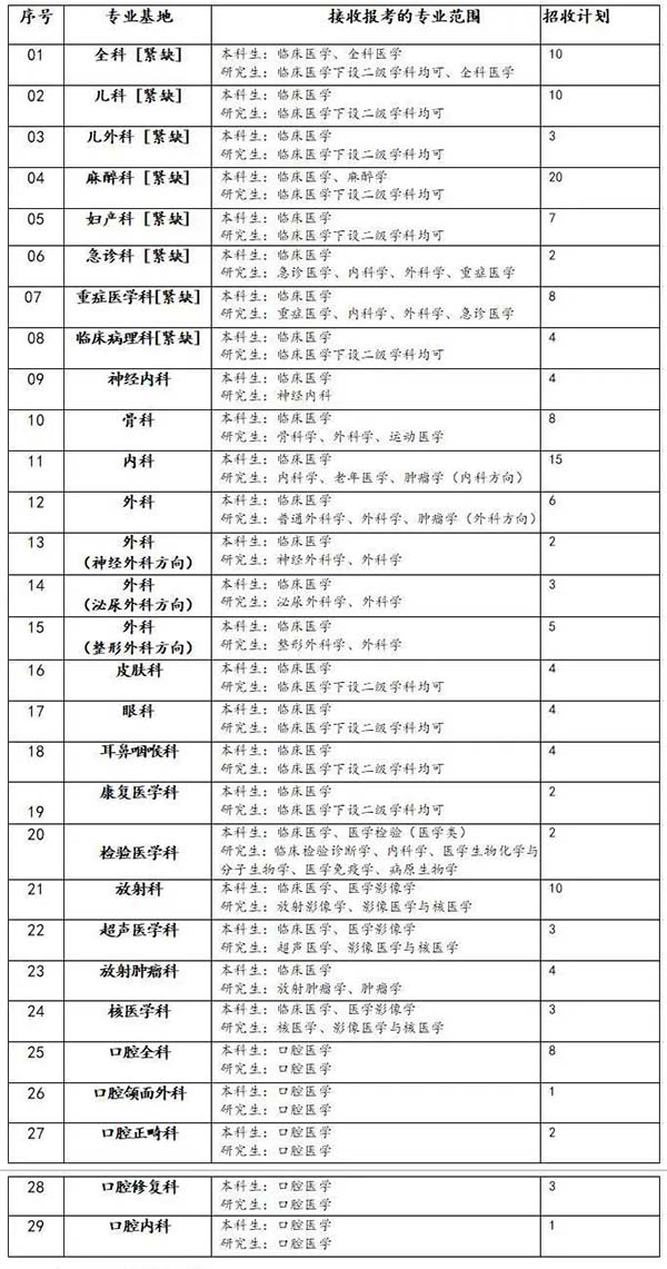 1.社会化住院医师:拟从事临床医疗工作的高等院校医学类相应专业(指临床医学类、口腔医学类)本科及以上学历毕业生(详见招生专业列表)。