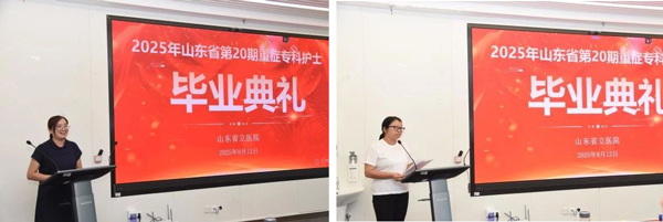 在感悟分享环节,学员代表潍坊市人民医院刘培和山东中医药大学第二附属医院冯淑娟以“知识洗礼、技能锤炼、思维升华”总结本次培训收获。她们表示培训基地围绕重症亚专科打造的系统化课程与带教精准实践指导培训体系,帮助她们掌握了多维度分析护理问题、精准实施干预的能力,显著提升了临床决策的科学性和时效性,特别感谢带教团队在专业技能、职业规划乃至生活细节上的全方位指导。此次培训还重新定义了她们对科研价值的理解,为职业发展开拓了新视野、注入了新动力。