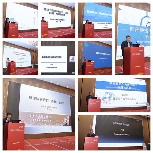 会议邀请省立医院胸外科彭忠民,复旦大学附属肿瘤医院胸外科主任陈海泉,首都医科大学宣武医院刘宝东,国家癌症中心刘谦,山东第一医科大学第一附属医院肿瘤中心主任叶欣,北京大学人民医院病理科韩博,山东第一医科大学附属肿瘤医院影像科黄勇,山东大学齐鲁医院上官红,山东中医药大学附属医院张阳,中国人民解放军联勤保障部队第九六〇医院袁耒教授等国内知名专家,围绕肺结节治疗方式的选择(手术、消融或SBRT?)、肺癌选择性淋巴结清扫的探讨、肺结节穿刺相关技术临床应用与进展、多发磨玻璃结节样肺癌最新进展、肺结节病理诊断中的“认知陷阱”与规避策略、囊腔样肺癌的干颜万面等主题进行了精彩的专题授课,内容涵盖学科前沿动态与临床实践经验,为与会同仁显著拓宽了理论视野并启迪了实践思路。