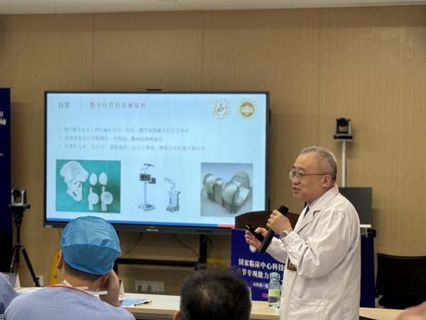 学术分享与手术直播环节,来自关节外科领域权威专家轮番登场进行了精彩展示。山东第一医科大学骨科研究院院长、山东省骨科医院常务副院长、省立医院骨科主任、骨关节科主任李伟教授以“山东省立数字化骨科进程”为主题进行学术讲座,系统梳理了医院在数字化骨科领域的探索历程、技术突破及临床应用成果,展现了数字化技术为骨科诊疗带来的革命性变化。
