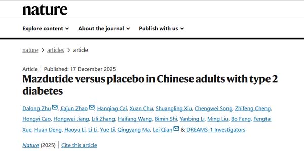 这一发现为2型糖尿病的临床治疗提供了重要的策略。研究成果以“Mazdutide versus placebo in Chinese adults with type 2 diabetes”为题,12月17日发表于国际顶级期刊《Nature》。