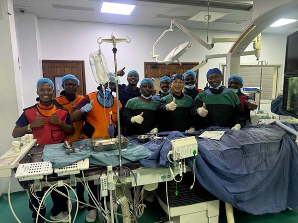 面对设备不足、耗材匮乏、技术体系尚未建立等多重困难,赵立健没有退缩。他敏锐地意识到,唯有帮助当地建立“可持续”的本土诊疗能力,才能从根本上改变现状。为此,他多方努力,从最基础的器械和耗材入手,积极推动国产封堵器在当地落地应用;自费购置部分关键介入耗材,缓解“巧妇难为无米之炊”的难题。在多方协调下,他成功举办坦桑尼亚首次先心病介入治疗培训与手术示范。