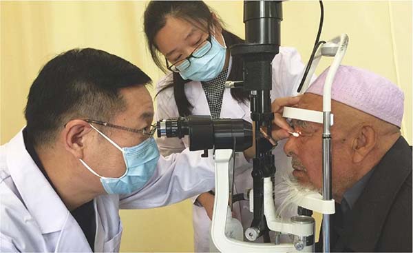 张晗在甘肃积石山县进行“光明行”活动时,为术后患者复查