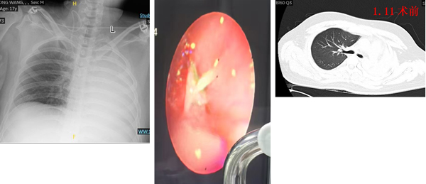 患者是一名17岁少年,车祸外伤后出现左肺完全性不张,胸闷、呼吸困难症状进行性加重。经胸部检查,发现患者左主支气管远端离断,同时存在左腿骨折,急需肺部病情改善后进行骨折手术。传统治疗方案需进行开胸支气管重建手术,但这一方案创伤巨大、恢复缓慢,且手术风险高,存在左全肺切除的可能,将对患者未来生活质量造成长期影响。面对危急复杂的病情,呼吸与危重症医学科科室负责人刘毅教授主持启动多学科会诊,经过充分论证,决定采用创伤更小的介入治疗方案。呼吸与危重症医学科副主任医师王永刚主刀,在胸外科病区副主任、副主任医师王光辉,胸外科副主任医师马国元协调保障下,实施球囊扩张联合硬质支气管镜下硅酮支架置入术。