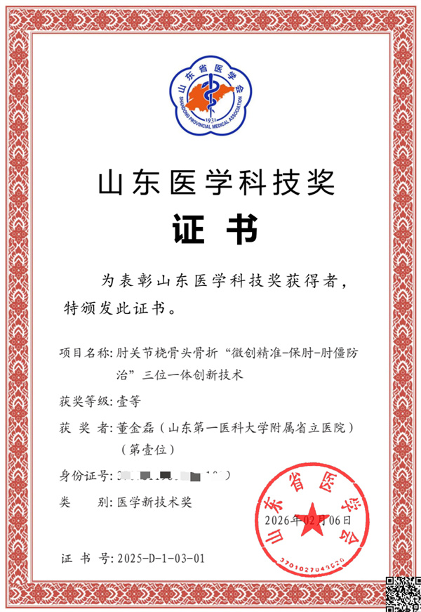 近日,由山东第一医科大学附属省立医院(山东省立医院)创伤中心奥体院区一病区副主任、主任医师董金磊牵头完成的“肘关节桡骨头骨折‘微创精准-保肘-肘僵防治’三位一体创新技术”项目,荣获2025年度山东医学科技奖医学新技术奖一等奖。