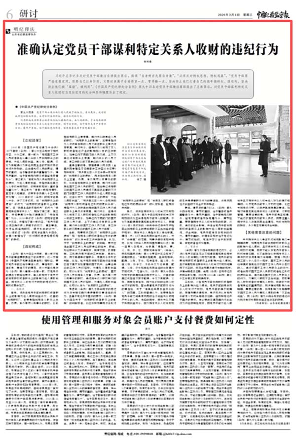 为巩固深化党纪学习教育成果,推动党的纪律教育常态化长效化,《中国纪检监察报》纪法周刊与山东省纪委监委联合推出系列文章,围绕党章党规党纪进行宣传阐释,2026年3月4日刊发文章《准确认定党员干部谋利特定关系人收财的违纪行为》。
