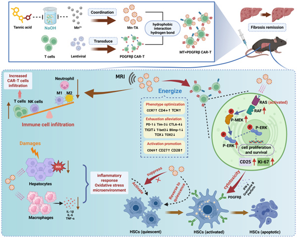 基于此理论,该团队设计了一种靶向PDGFRβ的CAR-T细胞,用于特异性清除aHSCs。为增强PDGFRβ CAR-T细胞的疗效,同时开发了粒径均匀且T1加权磁共振成像(MRI)表现优异的锰-单宁酸(MT)纳米颗粒免疫调节剂,该调节剂能够锚定于PDGFRβ CAR-T细胞表面,并有效重塑肝纤维化微环境。此外,该纳米颗粒也增强了CAR-T细胞的增殖能力,进而有效提高了CAR-T细胞的持久性和细胞毒性。研究结果证明,结合MT纳米颗粒的PDGFRβ CAR-T细胞疗法显著改善了抗纤维化治疗效果。该研究为CAR-T疗法在肝纤维化治疗领域的应用提供了新思路。