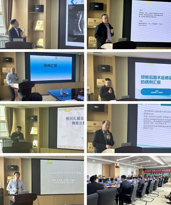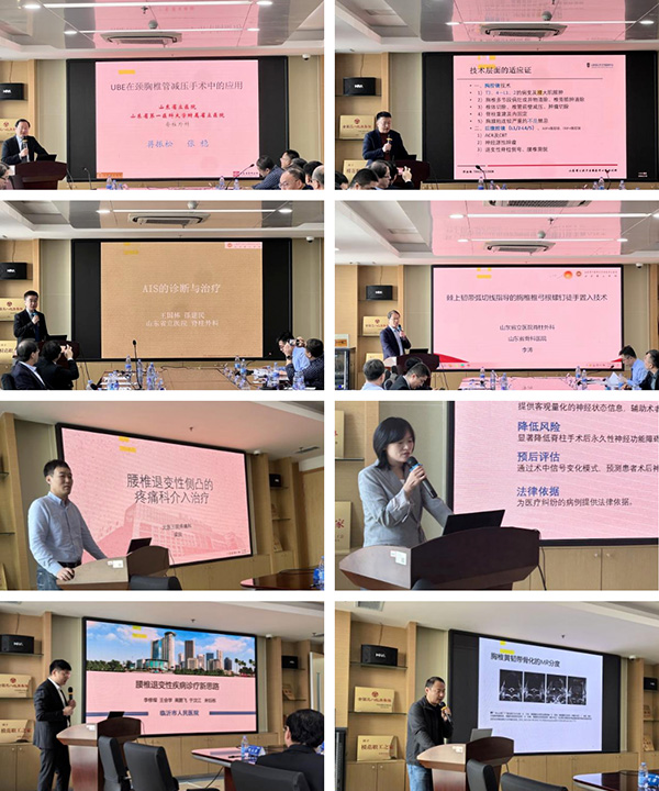 会议设置脊柱微创与感染诊疗新进展、脊柱畸形与精准诊疗及专题病例讨论环节,内容覆盖脊柱创伤、脊柱畸形、脊柱感染、微创技术等临床核心领域。省立医院蒋振松、王国栋、李涛、张雯,山东省公共卫生临床中心谭洪栋,北京大学第三医院梁辰等专家,围绕UBE技术在颈胸椎管减压手术中的应用、ASE技术在脊柱感染中的应用、青少年特发性脊柱侧凸分型策略、胸椎椎弓根钉徒手植入技术、腰椎退变性侧凸的疼痛科介入治疗及颈椎术中神经电生理监测等前沿技术,结合典型临床案例作专题分享。临沂市及各县区医疗机构骨干医师围绕UBE技术应用、腰椎退变性疾病、脊柱感染等展开实战经验交流。省立医院李阳围绕骨质疏松骨折诊疗原则等,与参会医师进行热烈讨论,为基层医师规范诊疗流程提供了精准指导。