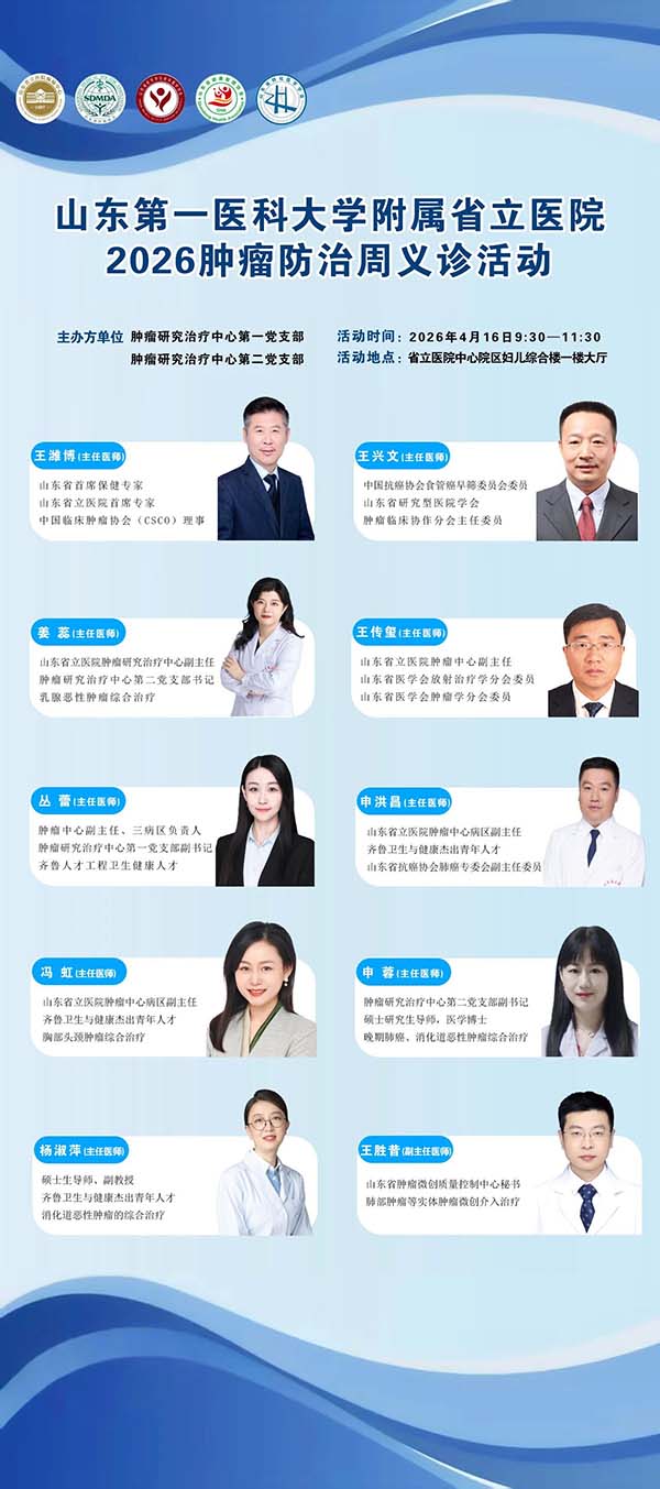 026年4月15日-21日是第32个全国肿瘤防治宣传周。为积极响应“健康中国2030”规划纲要提出的中国总体癌症五年生存率的宏伟目标,在全国肿瘤防治宣传周来临之际,山东第一医科大学附属省立医院(山东省立医院)肿瘤研究治疗中心第一党支部、第二党支部将于4月16日举行肿瘤患者义诊活动,助力全民防癌抗癌。