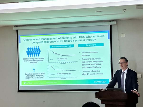Arndt Vogel教授以《肝癌围手术期系统治疗的范式转变与全球指南演进》为题,进行学术报告。他结合国际最新研究进展与指南更新,系统梳理了肝癌围手术期系统治疗的发展脉络,重点围绕早期肝癌复发风险、辅助与新辅助治疗探索、中期肝癌局部治疗与系统治疗的协同策略,以及多学科决策在肝癌治疗中的关键作用等方面进行了深入阐述。