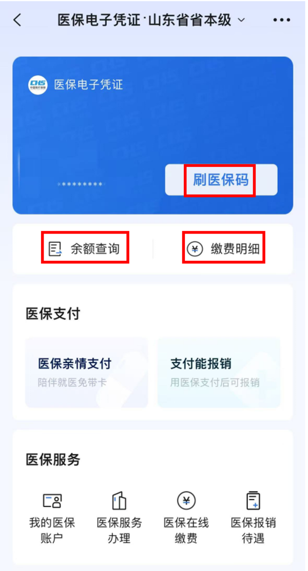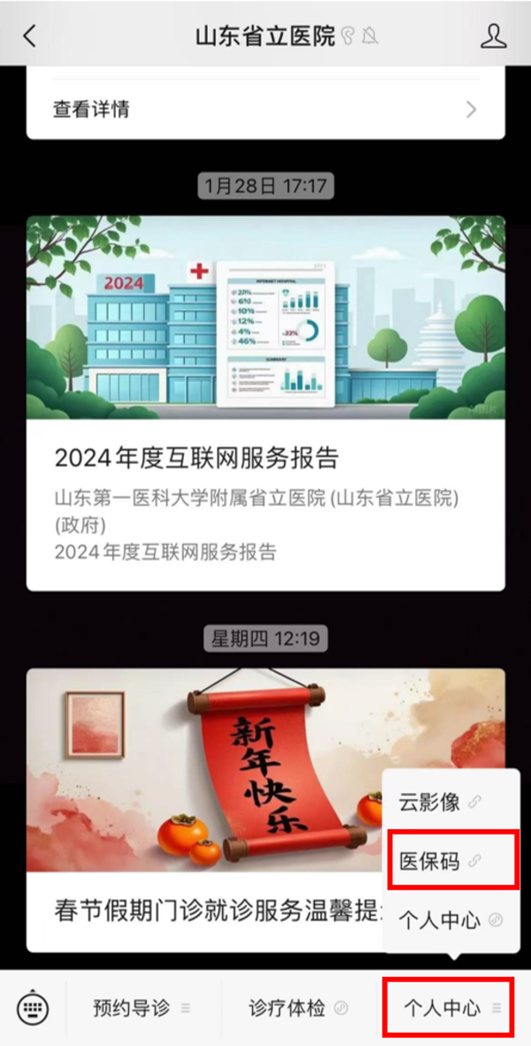 在我院就医时参保人可以通过“山东省立医院”公众号查找医保电子凭证并使用。