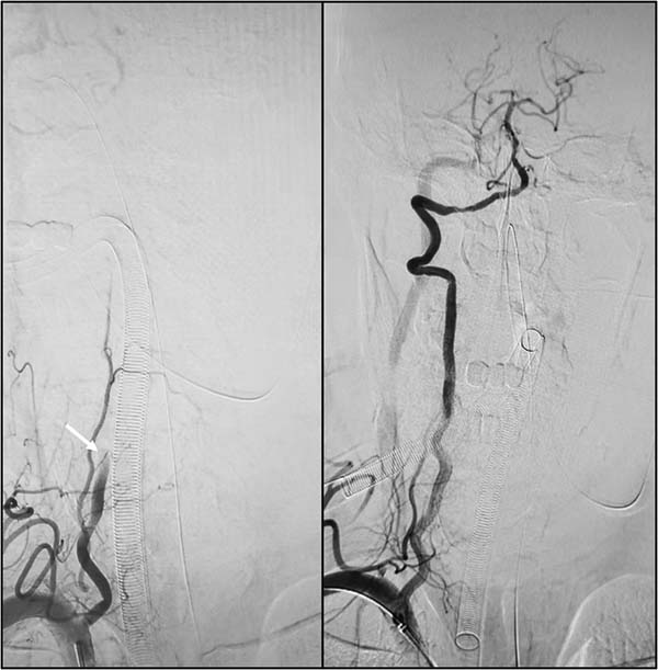 (左图白色箭头所示为闭塞的右椎动脉,右图为术后通畅的右椎动脉)