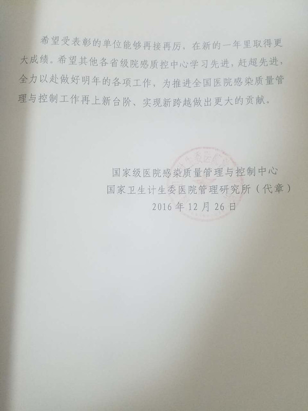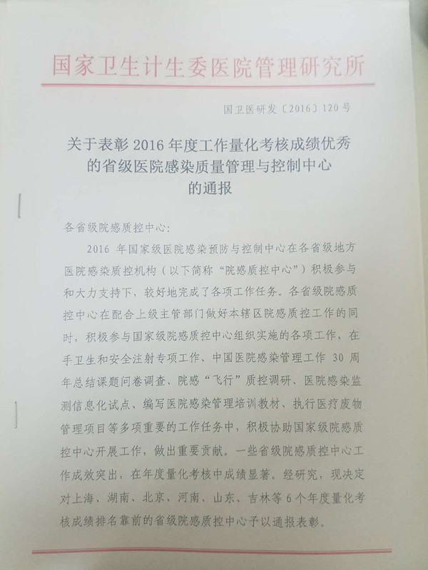 因在2016年度积极参与国家级院感质控中心实施的各项工作,在手卫生和安全注射专项工作、中国医院感染管理工作30周年总结课题问卷调查、院感染飞行质控调研、医院感染监测信息化试点、医院感染管理培训教材编写等多项工作中作出重要贡献,在2016年全国医院感染管理质控中心会议上山东省医院感染管理监控办公室被评为全国先进省级院感质控中心。
