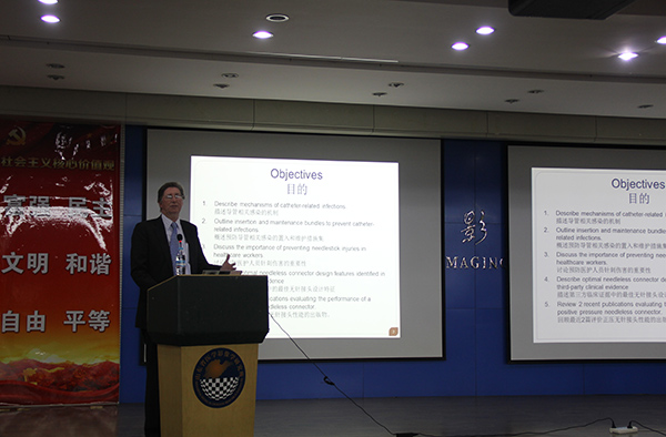 William先生首先进行了“美国CDC感控标准和透过无针接头减低感染研究”的专题授课,他主要围绕导管相关感染的发生机制、预防导管相关感染的置入和维护措施及医护人员针刺伤害的预防进行了分享。接下来,Marianne教授以“透过循证静脉输液预防并发症”为题从静脉输液相关问题、采用系统方法研究证据的重要性、以及如何透过循证寻找和制定静疗的标准等方面进行了精彩分享。两位专家的精彩授课赢得了在座的护理同仁的热烈掌声。