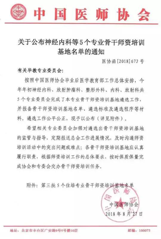近日,中国医师协会发布通知,公布第三批5个住培专业骨干师资培训基地名单,我院神经内科入选“国家首批神经内科住培骨干师资基地”!