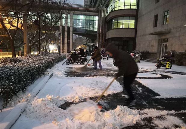 2月13日晚,济南迎来首场雨雪。为确保患者及医护人员出行安全,医院迅速启动雨雪天气清雪除冰应急预案,成立由保洁、保安等130名物业人员组成的清雪应急队,划片负责,落实到人。