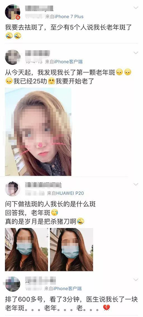 面对老年斑的说法,小伙表示难以接受,“我才27岁!咋就长老年斑了呢?”皮肤科医生则表示,其实,除了脱发,老年斑也都蔓延到了“90后”。一搜微博,发现一大波小仙女都中招了。